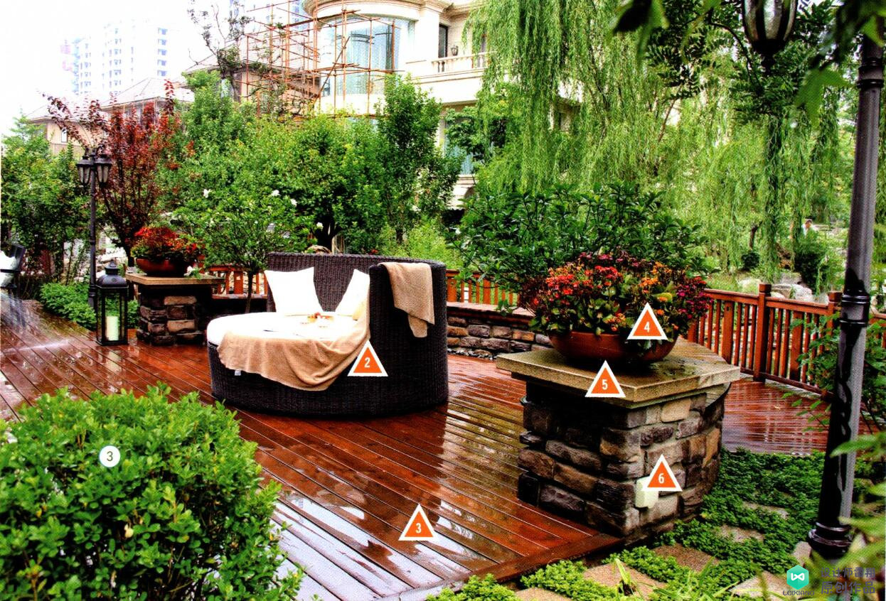 1.天然石板 2.藤制景观椅 3.防腐木地板 4.陶土花钵 5.大理石台面 6.文化石 7.防腐木座椅 8.湖石 9.木质花架