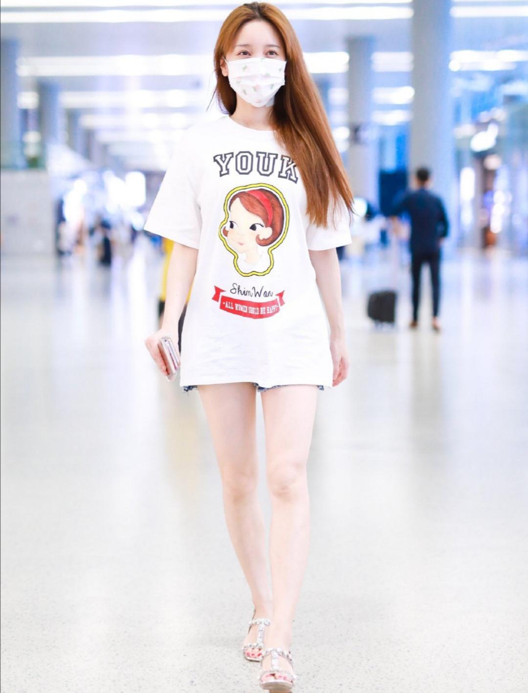 金莎的脸型虽然带着一点圆润,但身材却属于很匀称的类型。她穿上了一款带有卡通图案点缀的纯白色长T恤,还玩起了“下装失踪法”,展示出自己白到发光而又看着相当细腻的美腿。